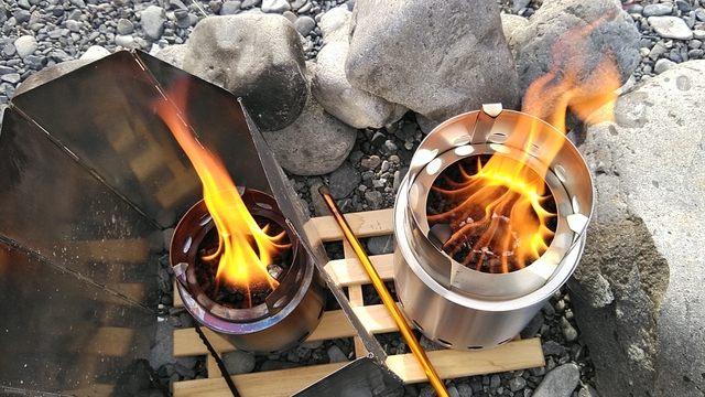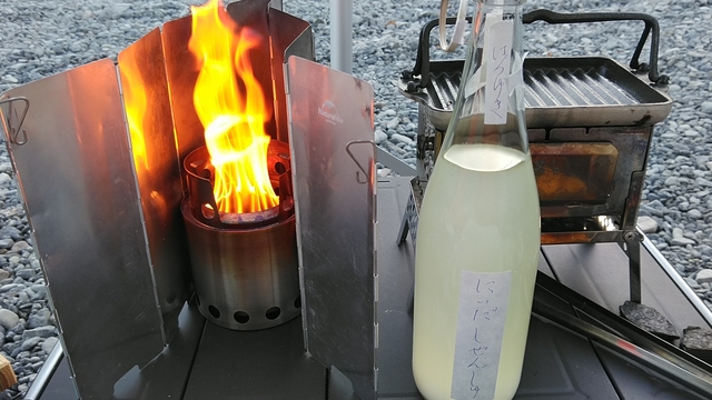 左のソロストが熾火になったら、シェラカップで燗してたら、